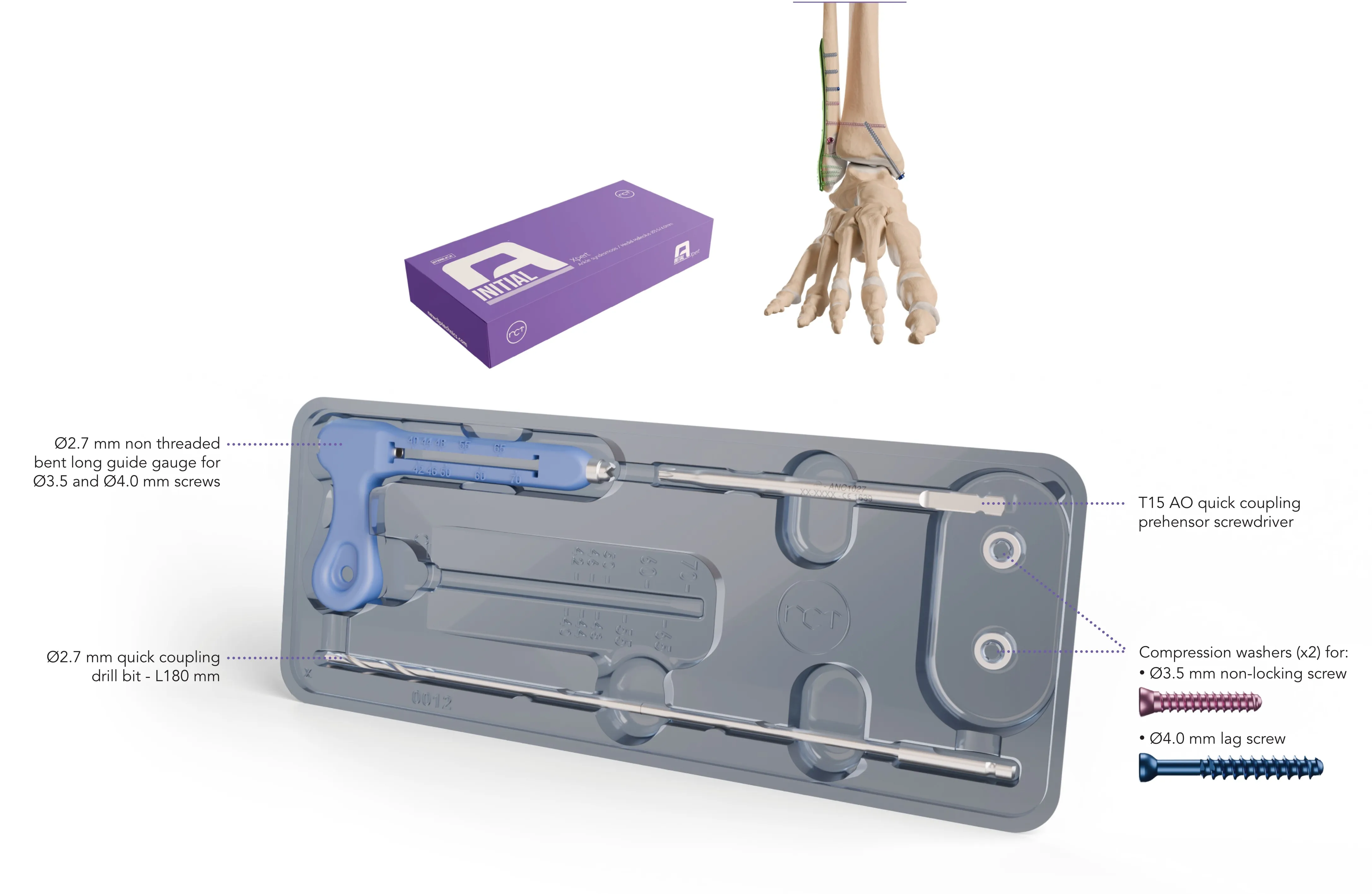 • Die Initial-Kits A™ - Fibula sind für die Fixierung von Frakturen, Osteotomien und Pseudarthrosen der distalen und diaphysären Fibula sowie der distalen Tibia bei Erwachsenen bestimmt.