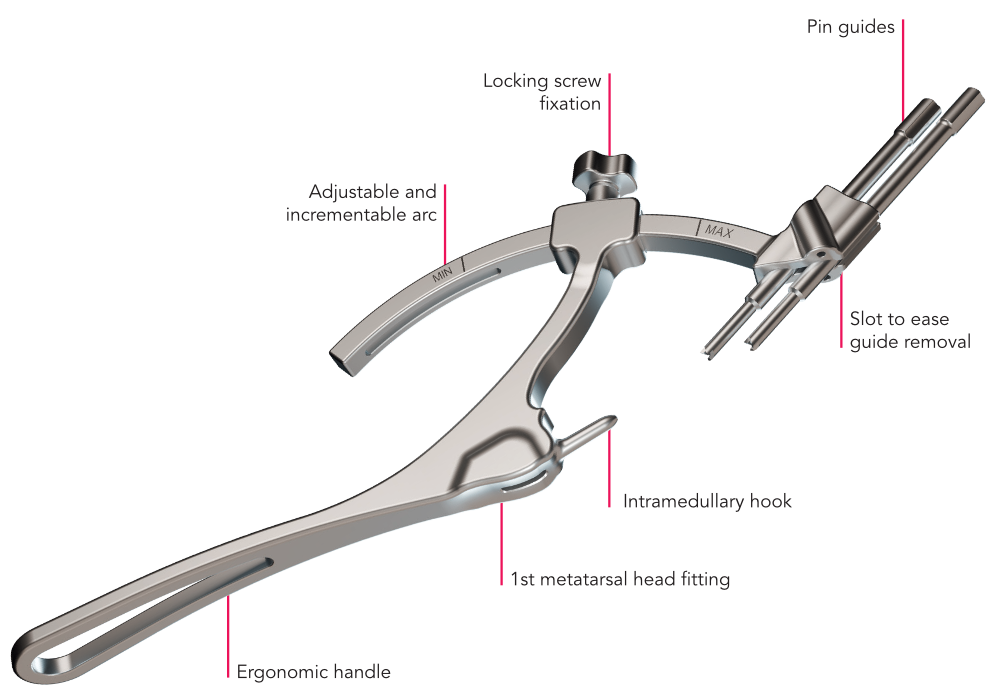 • Einstellbarer und stufenweise verstellbarer Bogen für eine systematische Ausrichtung auf den Kopf des ersten Metatarsus