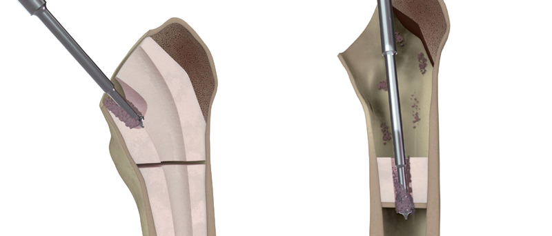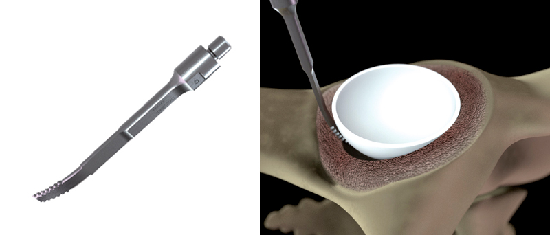 Des sondes spécifiques sont utilisées successivement pour ramollir et récupérer le ciment de l'os. La technique réduisant l’effort manuel au minimum permet d’obtenir un risque faible de fracture et de perforation de l’os.