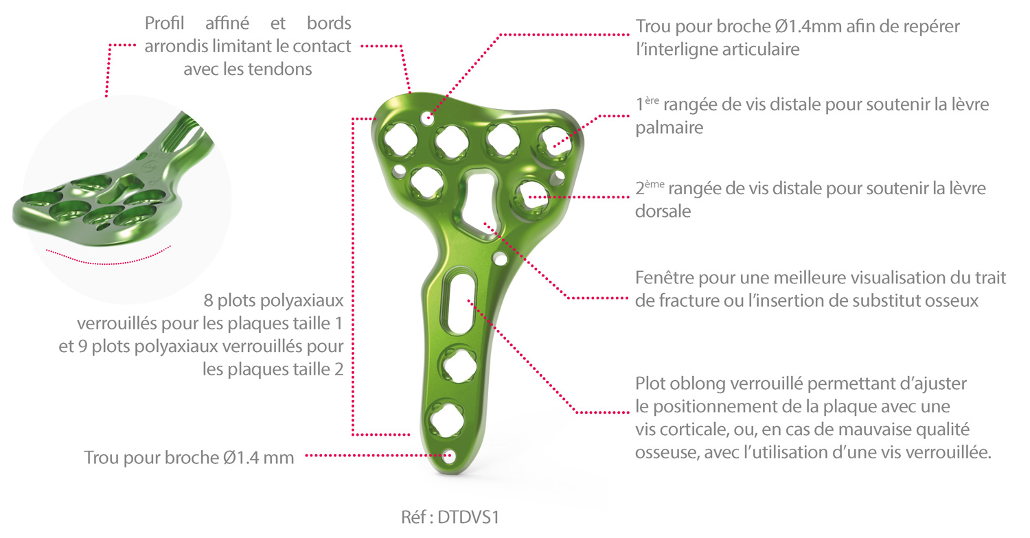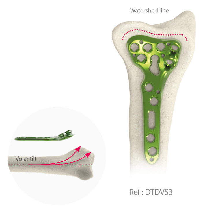 • Des rayons de courbure médial et latéral différenciés pour un volar tilt optimisé