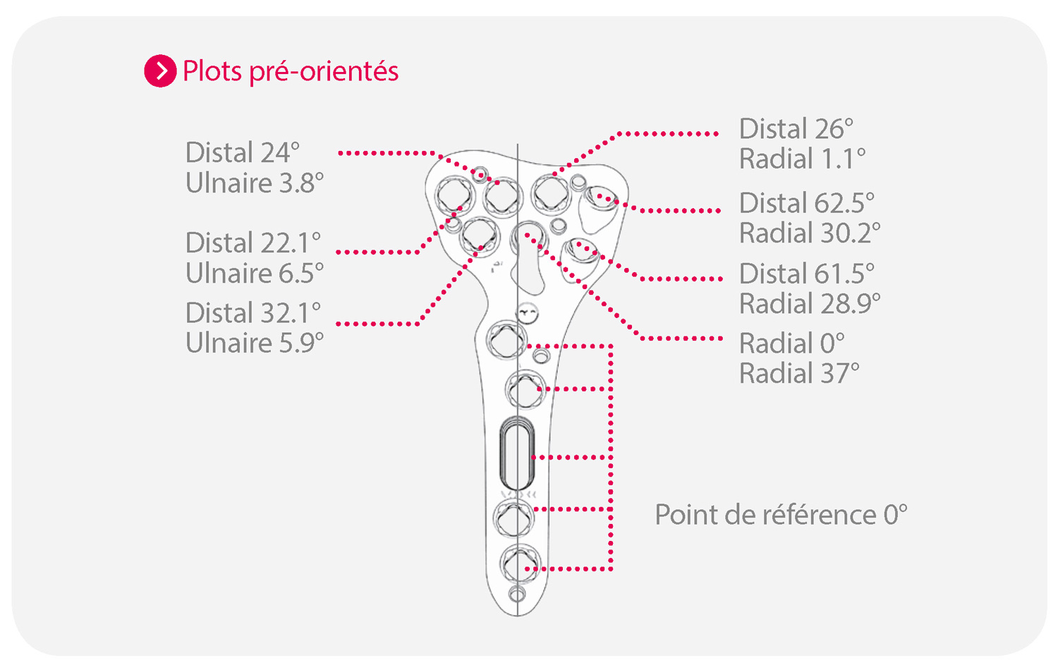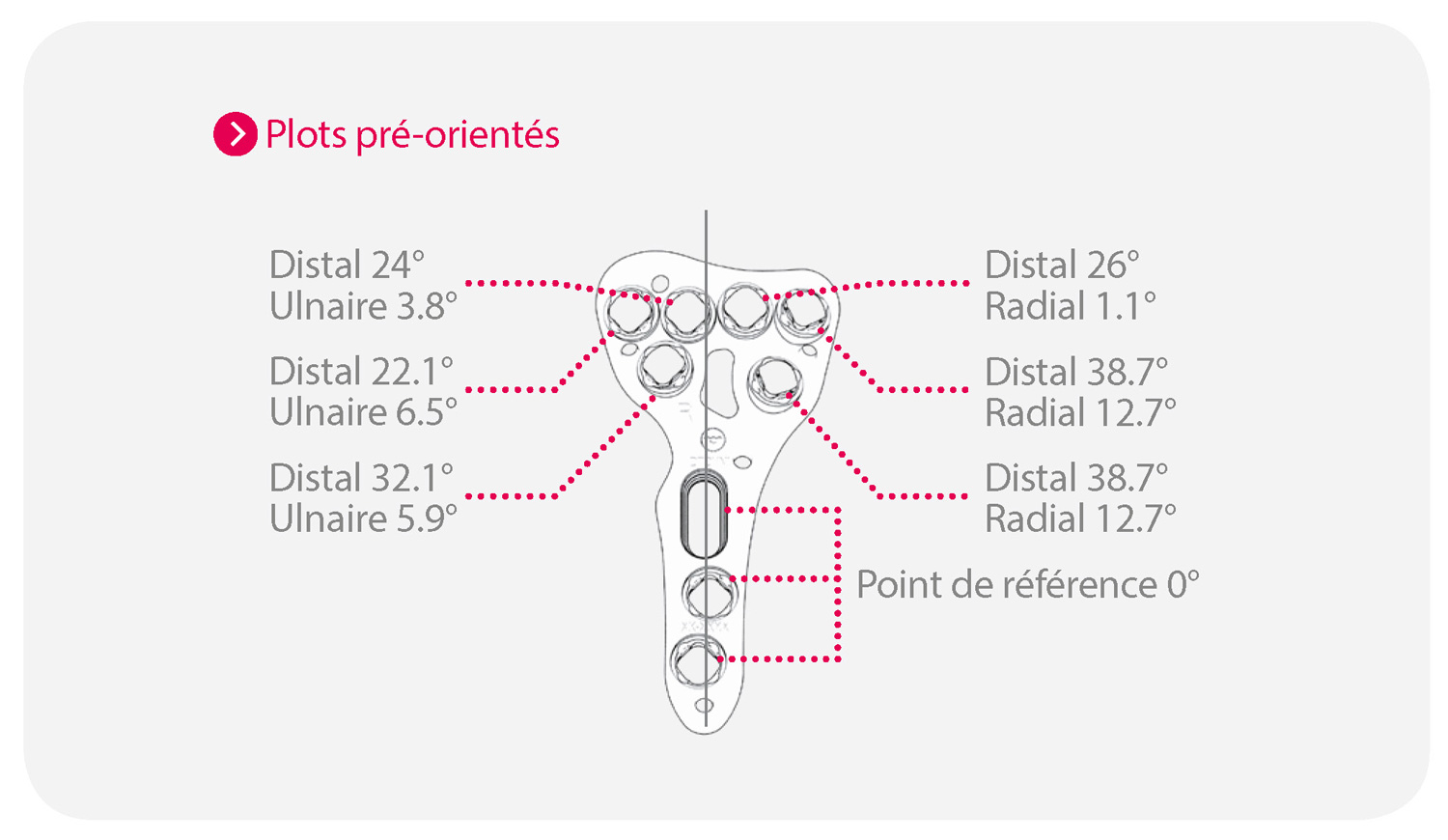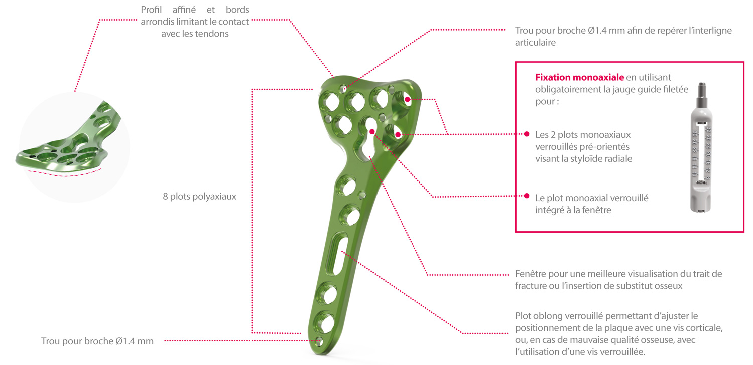 • Plots styloïdiens préorientés pour un positionnement optimisé des vis grâce à la jauge guide filetée