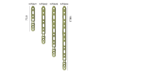 • 3 types de plaques : les médiales en 4 tailles (de 74 à 186 mm), les latérales en 5 tailles (de 67 à 207 mm) et les postéro-latérales en 5 tailles (de 71 à 213 mm).
